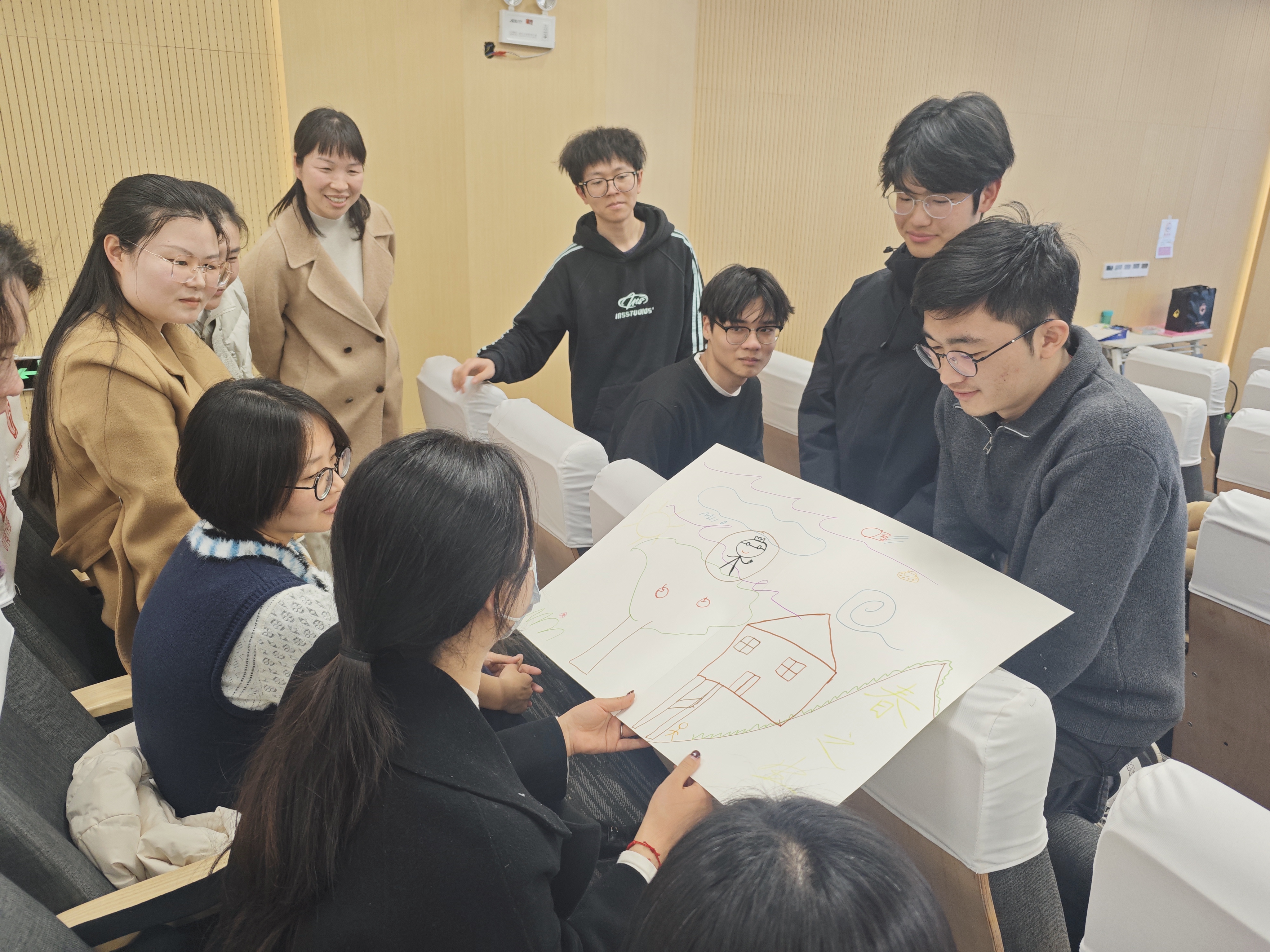 教师是心育工作的践行者,自身心理健康更需悉心呵护。紧随工作部署之后,以《减压赋能,遇见美好》为主题的关爱教师心理团辅活动温情开启,帮助教师卸下工作疲惫、舒缓心理压力。团辅以轻松有趣的热身游戏“雨点变奏曲”拉开帷幕,教师们跟随指令,用点手指、拍腿、鼓掌、跺脚模拟小雨、中雨、大雨、暴雨的节奏,现场氛围瞬间活跃,大家在欢快律动中放松身心、调整状态。热身结束后,王娟老师引导教师们开展自我觉察与压力自评,帮助大家梳理近期压力来源、复盘自我疏导方式,完成一次温柔的内心关照,深化自我认知。最具感染力的环节当属小组接力绘画“我们的支持能量圈”,教师们执笔创作,在画纸上勾勒属于自己的能量源泉,一幅幅画作串联起温暖而有力量的心灵故事。分享环节中,大家敞开心扉交流,既深入探索内心世界,也从同伴视角汲取多元力量,深切感受到团队的支持与温情,纷纷表示收获满满、倍受鼓舞。活动尾声,全体教师手挽手齐声呐喊励志口号,铿锵有力的声音传递出坚定信心,更彰显了彼此陪伴、携手前行的团队凝聚力。
