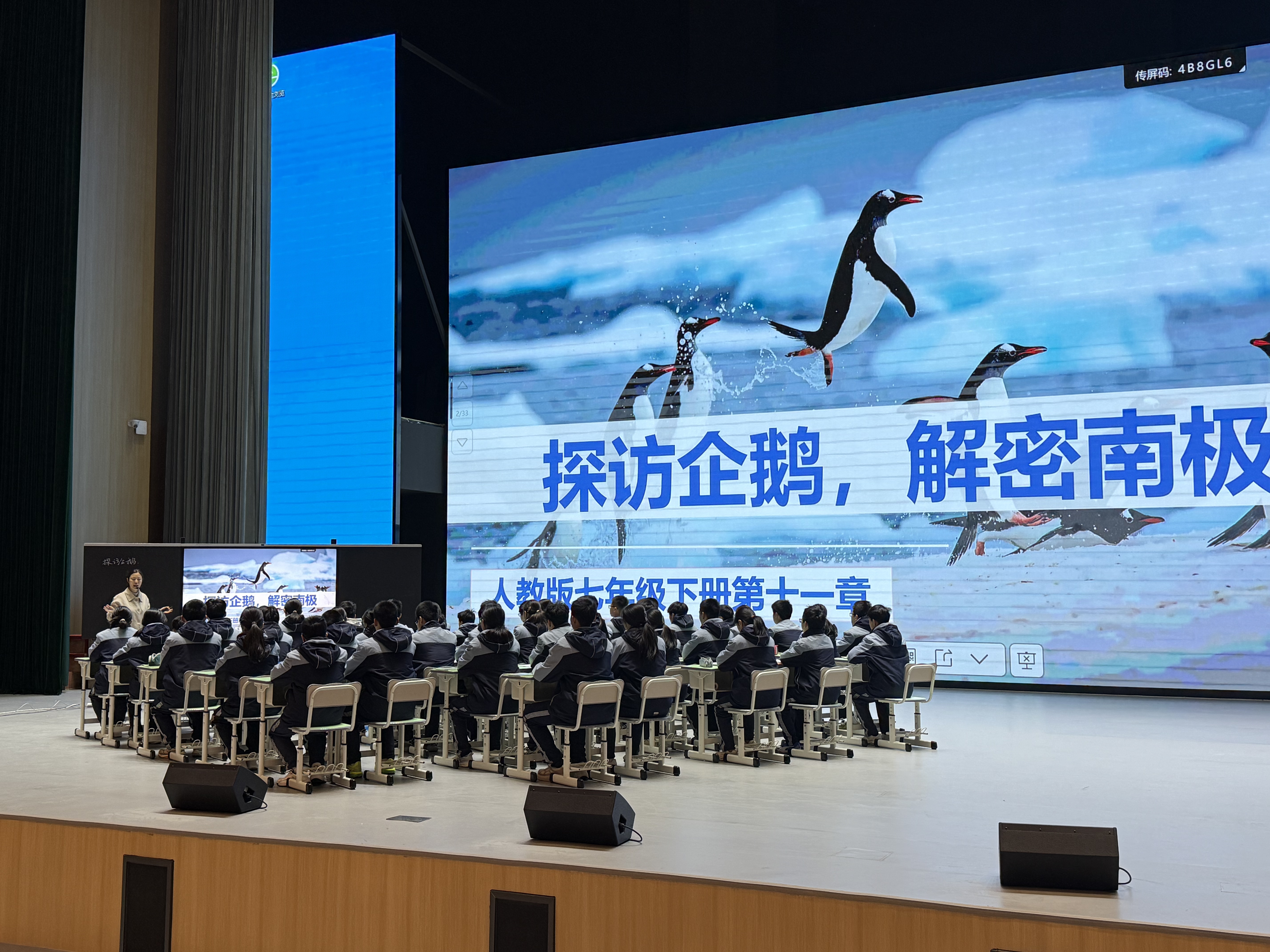活动伊始,河南省第二实验中学王孟宇老师带来题为《探访企鹅 解密南极》的观摩课。本节课分为三个环节,在“自然环境,我不怕冷”环节,她引导学生从南极地理位置切入,通过阅读材料提炼“酷寒、干燥、烈风”的气候特征,随后聚焦企鹅生存智慧,让学生直观感受生物与环境的适配关系;“科学考察,科考有我”环节中,师生围绕“南极泰山站设计优势”展开合作探究,将极地科考知识与工程思维深度融合;“环境保护,说你爱我”环节则创新采用抽签分组、分角色讨论的形式,让学生以“南极守护者”视角分享环保建议,在互动中强化生态保护责任意识。
