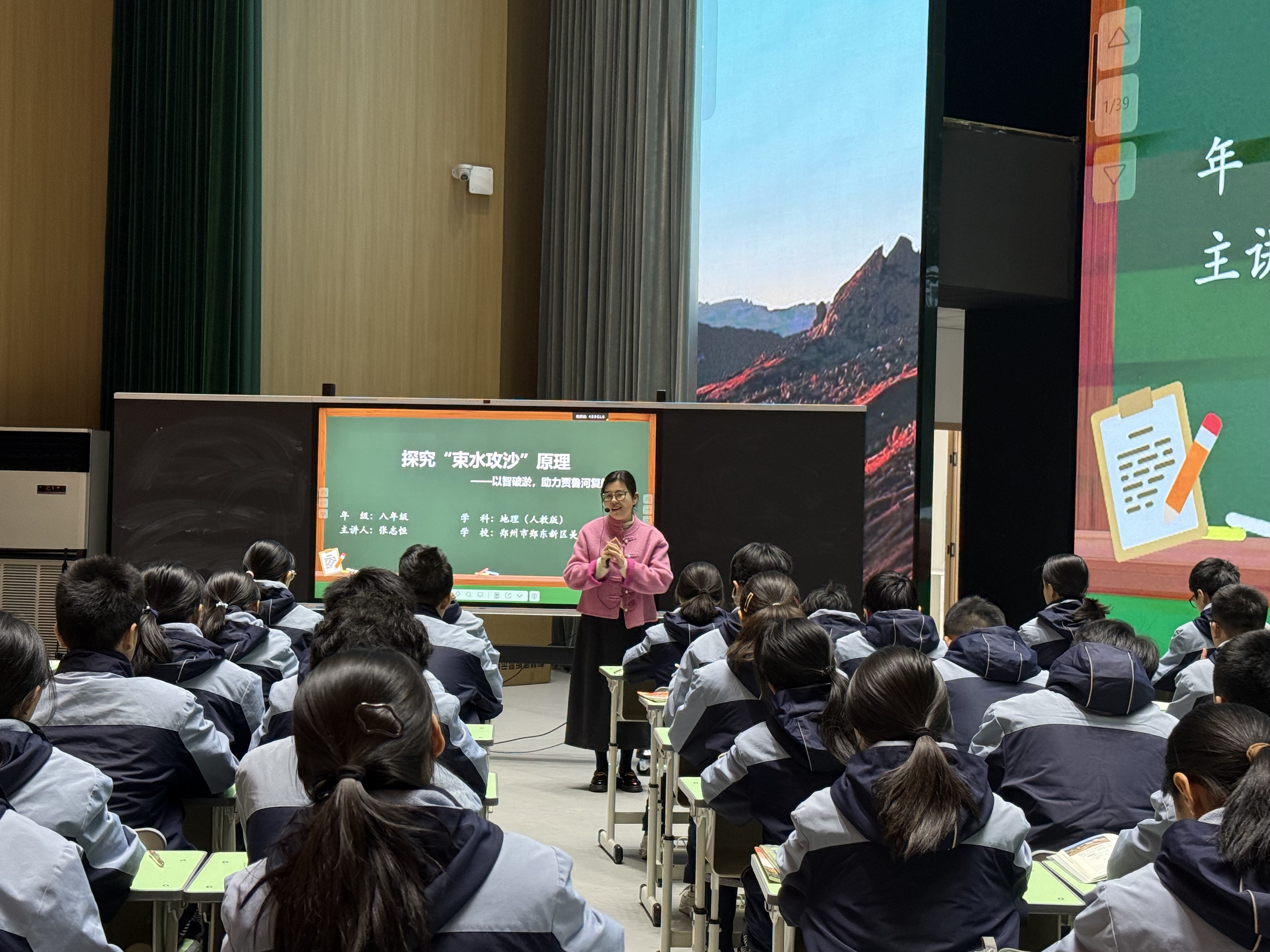 紧接着,郑州市郑东新区美秀初级中学张志恒老师呈现了《探究“束水攻沙”原理——以智破淤,助力贾鲁河复航》一课。课堂以贾鲁河复航实景视频导入,迅速将学生带入“复航之困”的真实情境,通过分析泥沙淤积的成因与影响,引发学生解决问题的思考;在“攻沙之智”环节,张老师通过模拟实验,融合数学、物理知识层层拆解“束水攻沙”的科学原理;“古今通鉴”环节通过对比古今调沙案例,帮助学生构建知识迁移能力;在“实践献策”环节,学生以创意绘画、AI模拟历史人物潘季驯、制作沙盘模型等形式,将治淤思路转化为可视化、可操作的实践方案,充分展现了地理学科“学以致用”的独特价值。