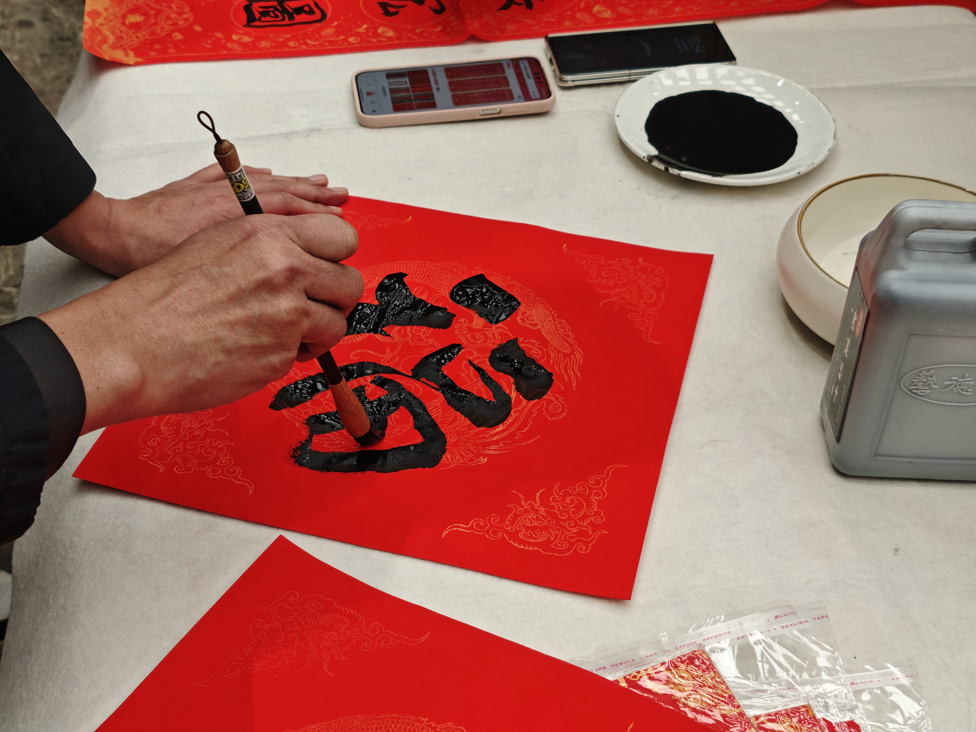 在古韵余音与诗韵萦绕的氛围中,书法家们凝神聚气,笔下生花,一幅幅既富传统年味、又饱含东坡文化底蕴的原创春联跃然纸上,红纸墨香间,千载文脉与万家祥和实现了美好交融。