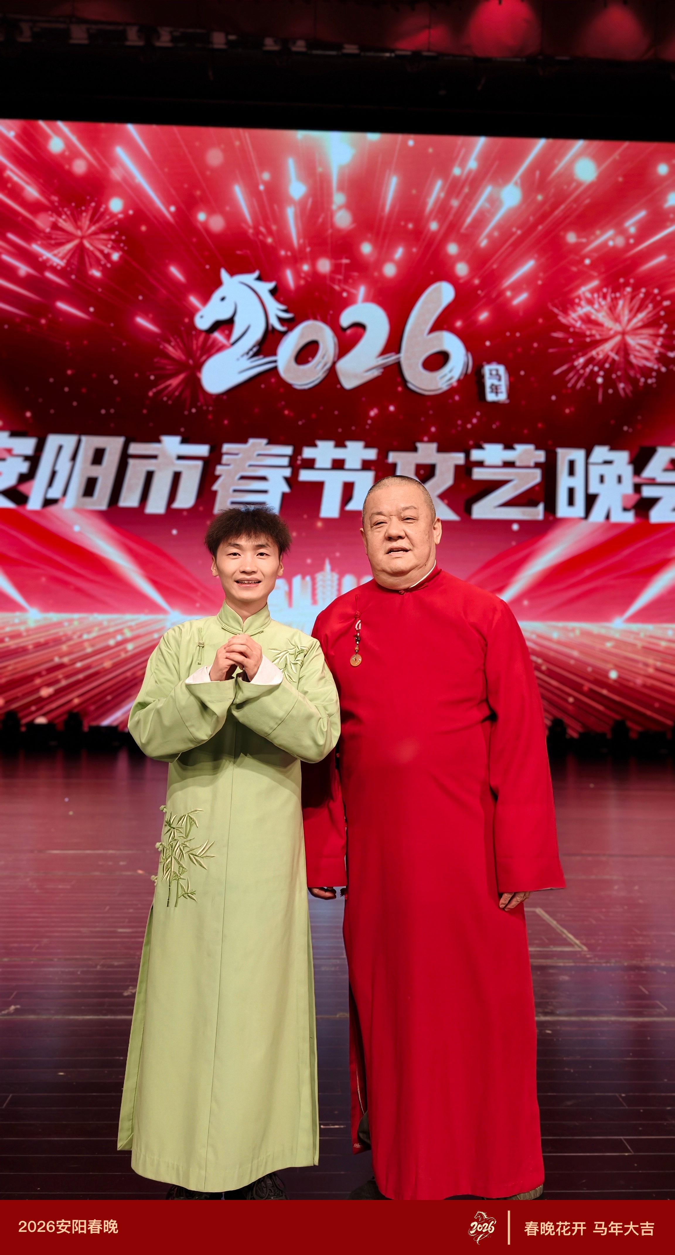 2026年安阳市春节文艺晚会于近日顺利完成录制,晚会荟萃各类精彩节目,郑东新区文化馆馆员潘凯受邀参与本次晚会录制,与搭档共同表演了原创相声作品《马年吉祥》,该节目以其独特的创意、接地气的表达和精湛的舞台呈现,成为晚会语言类节目中一抹亮色,不仅传递了新春的欢乐,更充分展示了郑东新区群众文化工作者的艺术风采和专业素养。