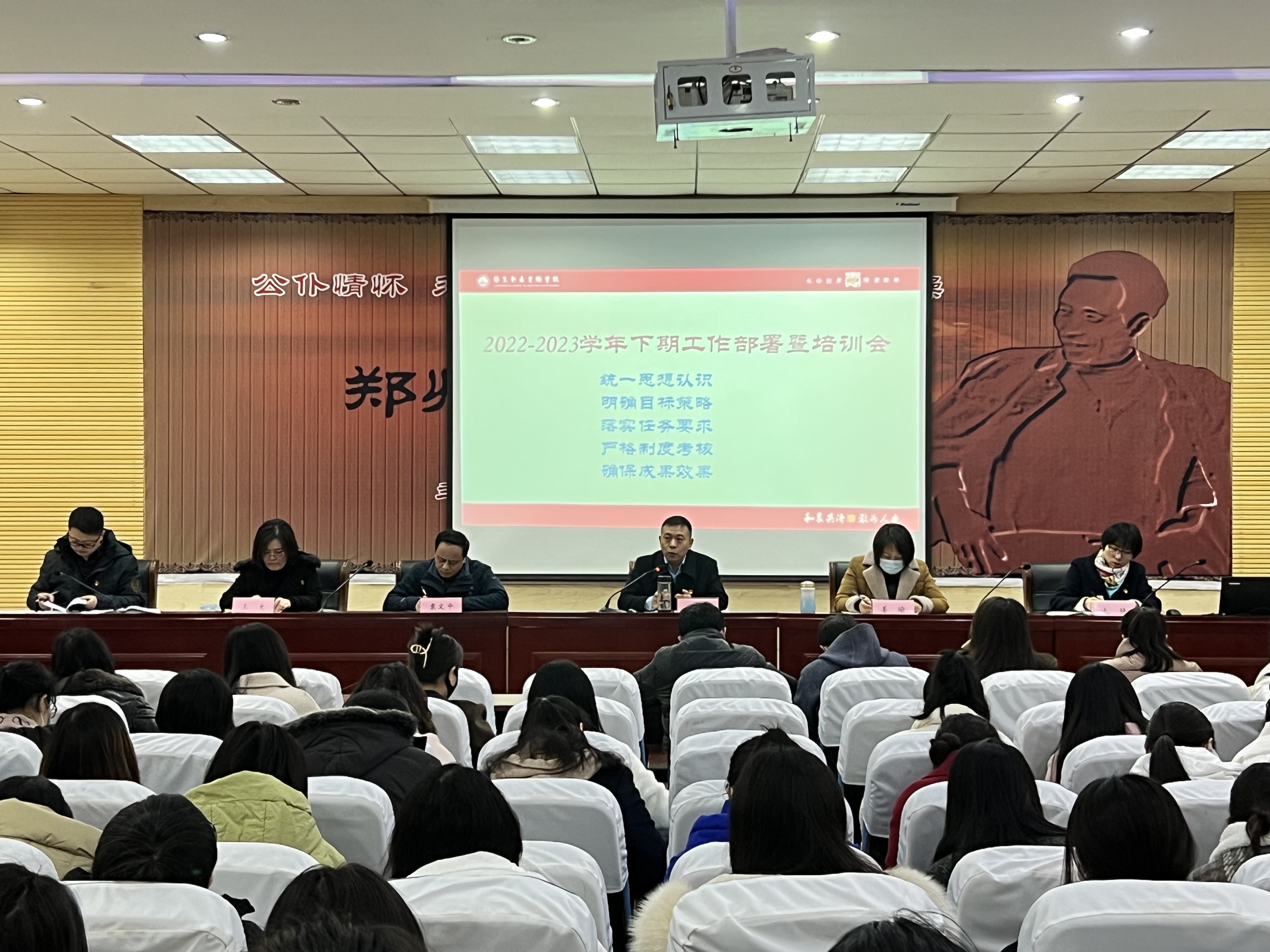 2023年2月6日上午,郑州市郑东新区九年制实验学校在道德讲堂开展文化建设引领学校发展专题培训暨新学期工作部署会议,全体教师参加。