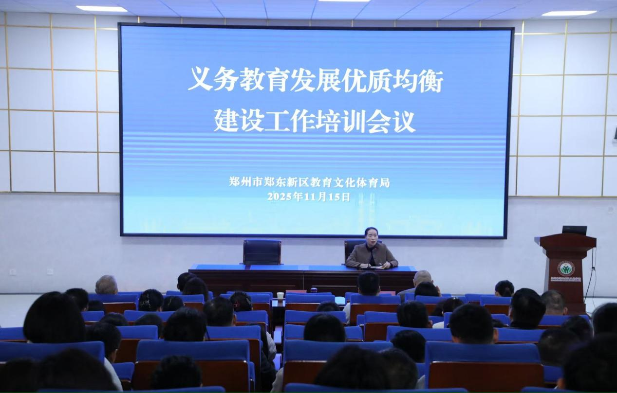 为加快推进义务教育优质均衡发展建设进程,进一步巩固省级过程性督导成果,全面提升区域义务教育优质均衡建设水平,2025年11月15日,郑东新区教文体局组织召开“义务教育优质均衡建设工作培训会”。会议由郑东新区教文体局党委委员乔健主持,局机关相关科室负责人及联络员、辖区公民办中小学主抓建设工作的副校长及具体负责人、专职督学共计150余人参加培训。