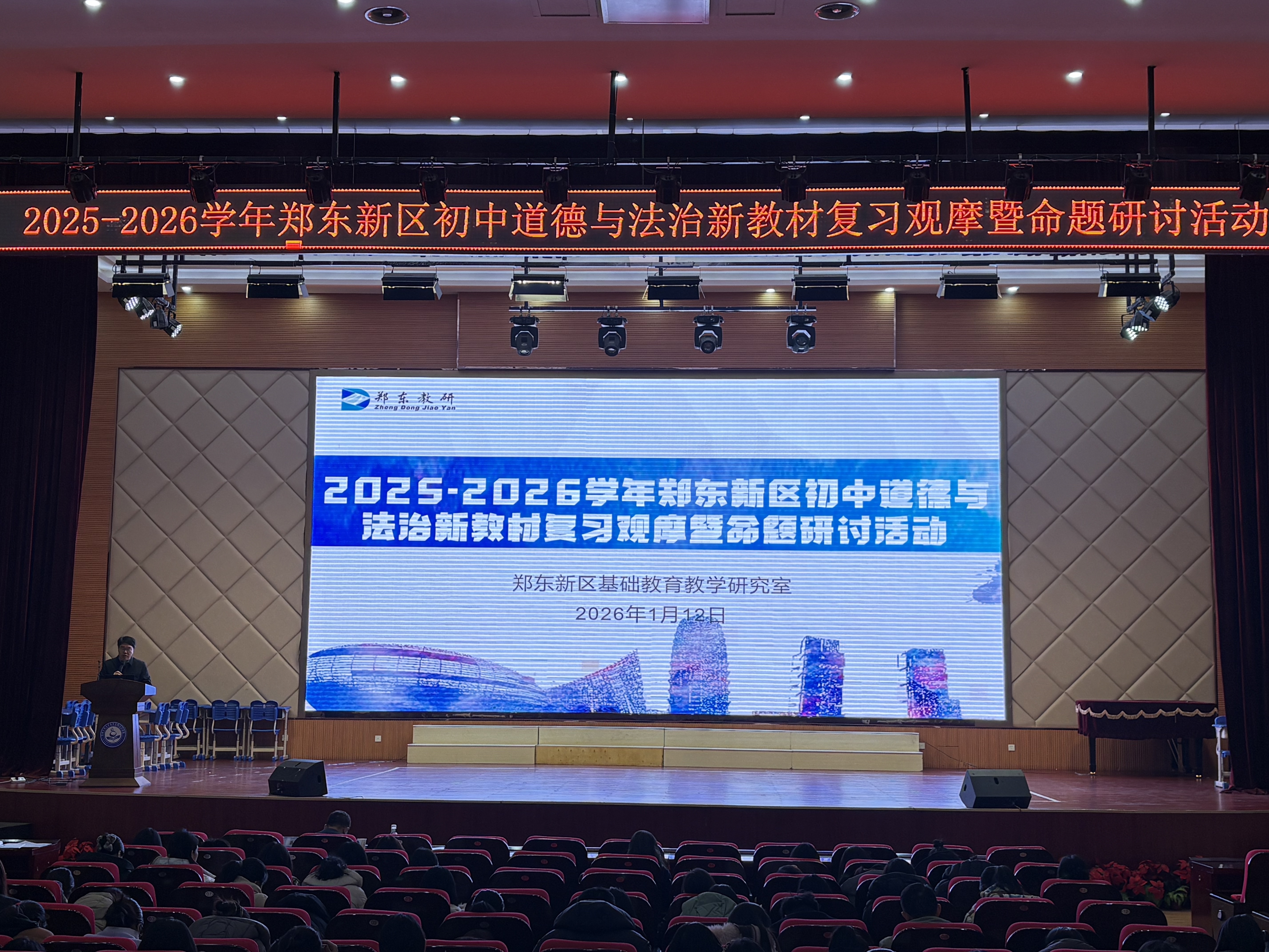 2026年1月12日下午,2025-2026学年上学期郑东新区初中道德与法治新教材复习观摩暨命题研讨活动在郑东新区九年制实验学校报告厅顺利落幕。郑东新区七八年级全体道德与法治教师及九年级备课组长齐聚一堂,以复习课例展示、备考经验分享、命题策略研讨为核心议题,共探学科教学提质增效路径,凝聚“以考促教、育德赋能”的教学共识。