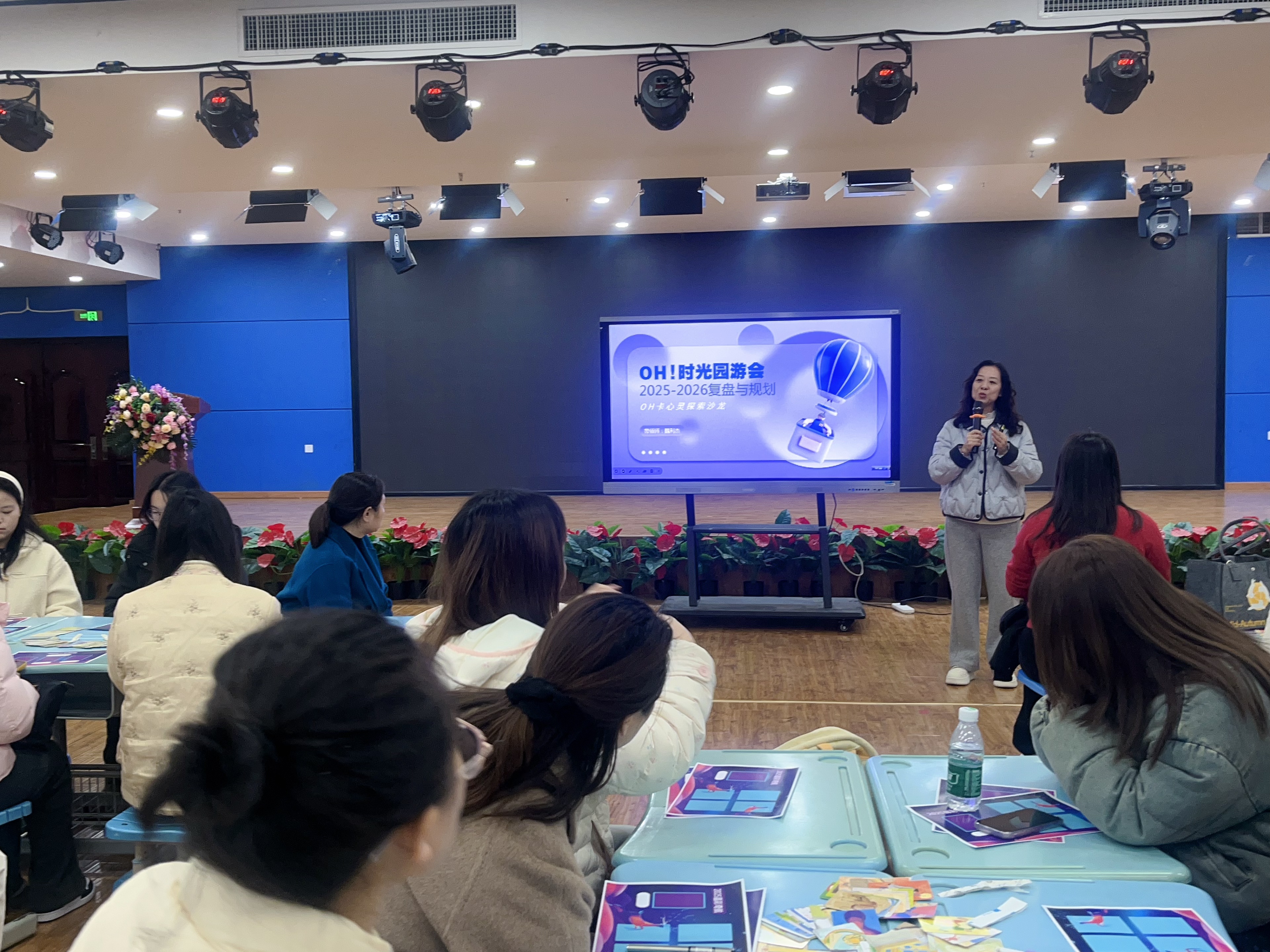 在魏利杰老师引领的OH卡牌“园游会”中,教师们通过四大沉浸式环节完成了一场深刻的心灵旅程。活动以“2025亮灯仪式”开启,教师们用星星灯为年度满意度打分,并借一张卡牌提炼年度关键词,在分享中完成对过去的温情复盘。进入“2025晶彩奇航”,教师们选取代表高光、挑战与小确幸的卡牌,深入剖析背后的成长与感恩,在“一切经历不是得到就是学到”的启发下,真正理解了复盘的意义——从经历中汲取能量。随后,“2026人生剧场”将焦点转向未来。教师们为新年设定“人生主旋律”与关键角色,并通过盲选卡牌获得具体的“行动指引”,让抽象目标落地为清晰路径。最后,“神奇彩虹屋”以温暖的彩虹卡收尾,那些“相信直觉”“每一步都有意义”的句子,如同潜意识馈赠的能量种子,为2026年的行动注入信心与宁静。整场活动不仅是一次工具体验,更是一场心灵的梳洗与赋能,帮助教师在回顾中看见成长,在规划中明确方向,最终带着清晰与温暖的力量,迈向新的一年。