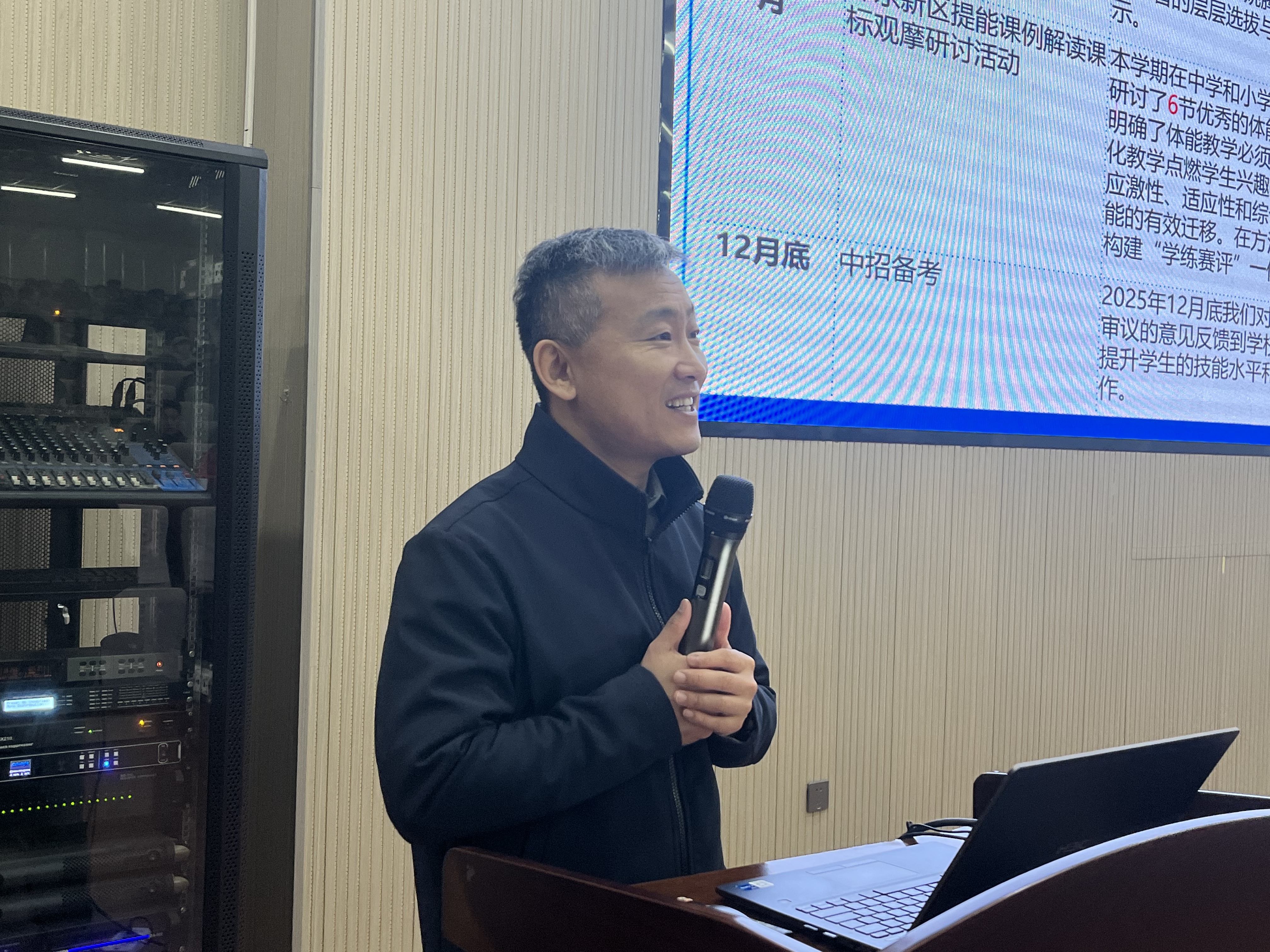 紧接着,张老师围绕课程纲要审议开展专题培训。他精准指出当前体育教学中存在的课程纲要落实不到位、教学方式单一、课堂效率不高等现实问题,提出从本学期开始将全面推行体育与健康课程审议制度,要求全区体育教师要以国家课程校本化实施为核心,进一步规范课程纲要撰写、审议、修改与备案全流程,真正实现教学有依据、实施有路径、评价有标准。同时,他强调本学期将持续深化观摩研讨课活动,大力推进小组合作学习,强化课堂常规管理,严格落实学生体质强健计划,全面提升体育课堂育人质量。