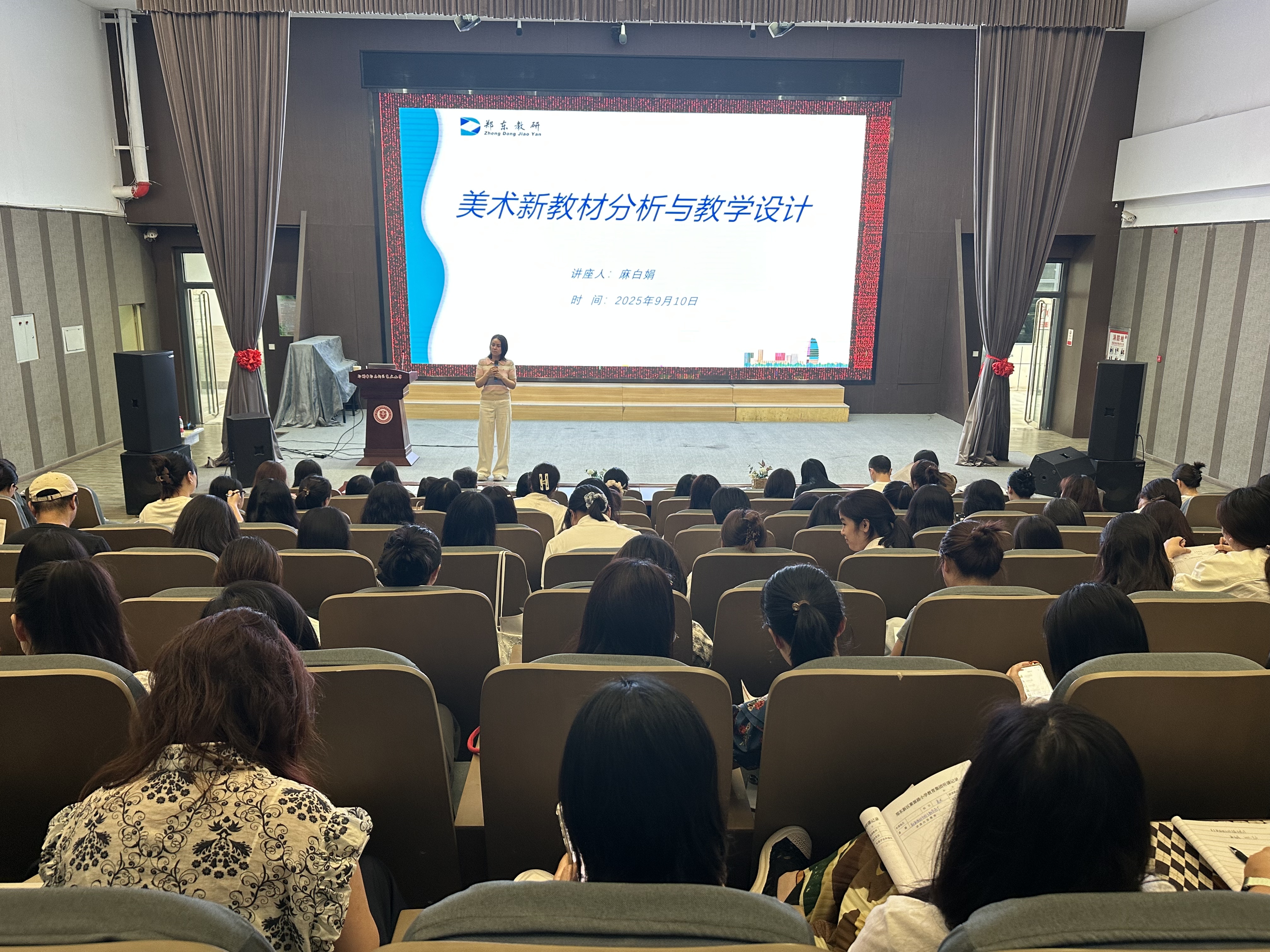 9月10日,郑州市郑东新区2025—2026学年上学期中小学美术新教材培训会在郑州市郑东新区艺术小学报告厅隆重召开。会议由郑州市郑东新区中小学美术书法教研员麻白娟主持,并做了题为“美术新教材分析与教学设计”的专题讲座。区属两百余名中小学美术、书法教师参加了此次会议。此外,新疆哈密市的王丽霞、杨江、高洪箭名师工作室负责人及其骨干成员也通过线上形式参与了新教材的培训与交流。