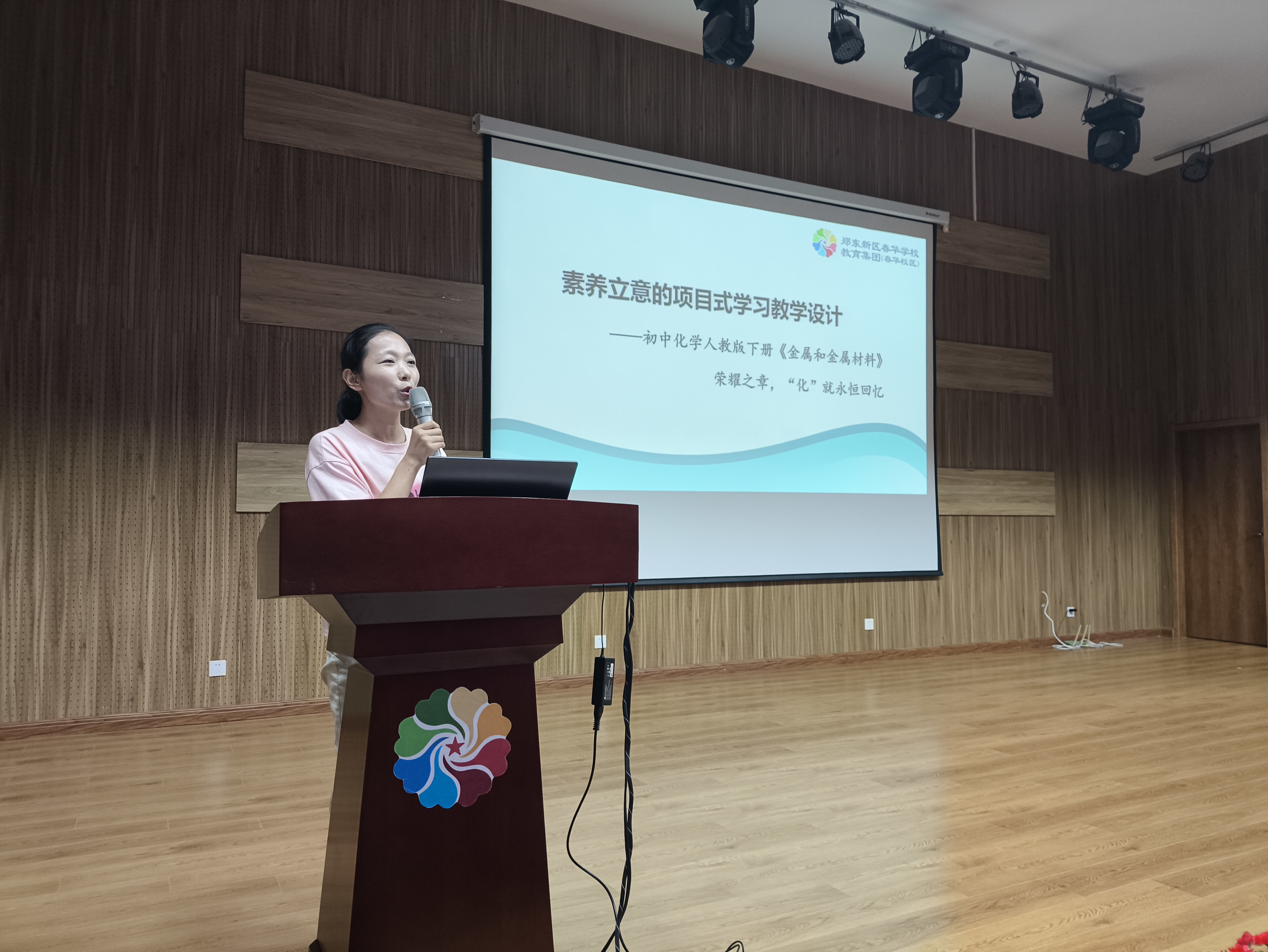 活动开始,郑东新区春华教育集团韩丽老师以《金属与金属材料》单元为例,分享“素养立意的项目式学习教学设计”。韩老师围绕核心问题,以“设计运动会奖章”为核心任务,设计金属性质探究、材料选择、蚀刻制作等系列活动,同步融入多元教学评价——通过课堂观察记录学生探究过程、依据奖章设计方案评估应用迁移能力、结合作品展示判断素养达成度,实现“教—学—评”一体化。整体设计紧扣理解 “物质性质影响其应用”大概念,打破课时壁垒,推动知识学习与真实问题解决深度融合,切实助力学生形成学科素养。