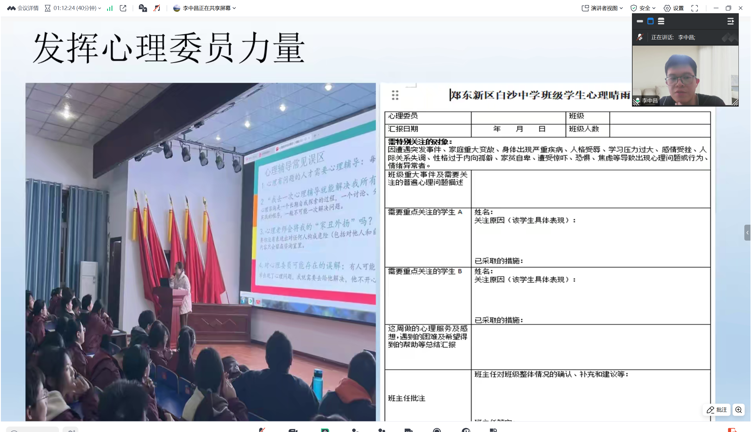 随后,多所学校专职心理教师分享了极具实操性的工作经验。郑东新区康宁小学程铭老师围绕测评全流程展开,从前期细致的准备工作、测评过程中的重点注意事项,到测评结束后的清单建立、班主任协同及后续跟踪机制,将学校的成熟做法倾囊相授;郑东新区白沙初级中学李中昌老师则在汇报本校测评组织与建档工作的基础上,重点介绍了心理辅导预约表、心理委员专项培训、新生心理状况摸排等特色举措,为各校打造个性化工作模式提供了新思路。