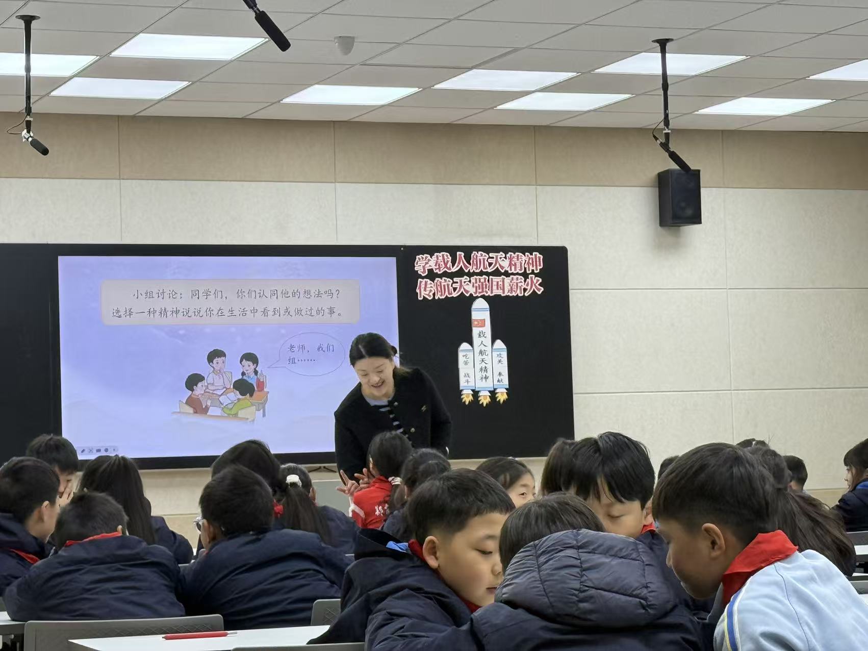 云台小学教师乔会红执教《学载人航天精神,传航天强国薪火》一课。课堂上乔老师以卡通人物“航航”探访航天城为主线,通过航天员训练视频、模拟体验“转移训练”,通过邓清明、杨宏等航天人的故事,让“特别能吃苦、战斗、攻关、奉献”的精神变得可感可触,借助小组讨论打破“精神遥远”的困惑,引导学生从“认真完成作业”“帮助同学”等小事中找到精神共鸣。课后,通过布置“我的航天员成长日志”实践作业,将课堂教育延伸到日常生活,让思政课堂既有思想高度,又有生活温度。