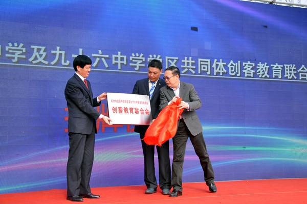 郑州市教育局副局长田保华为“郑州市回民中学及九十六中学区共同体创客教育联合会”揭牌