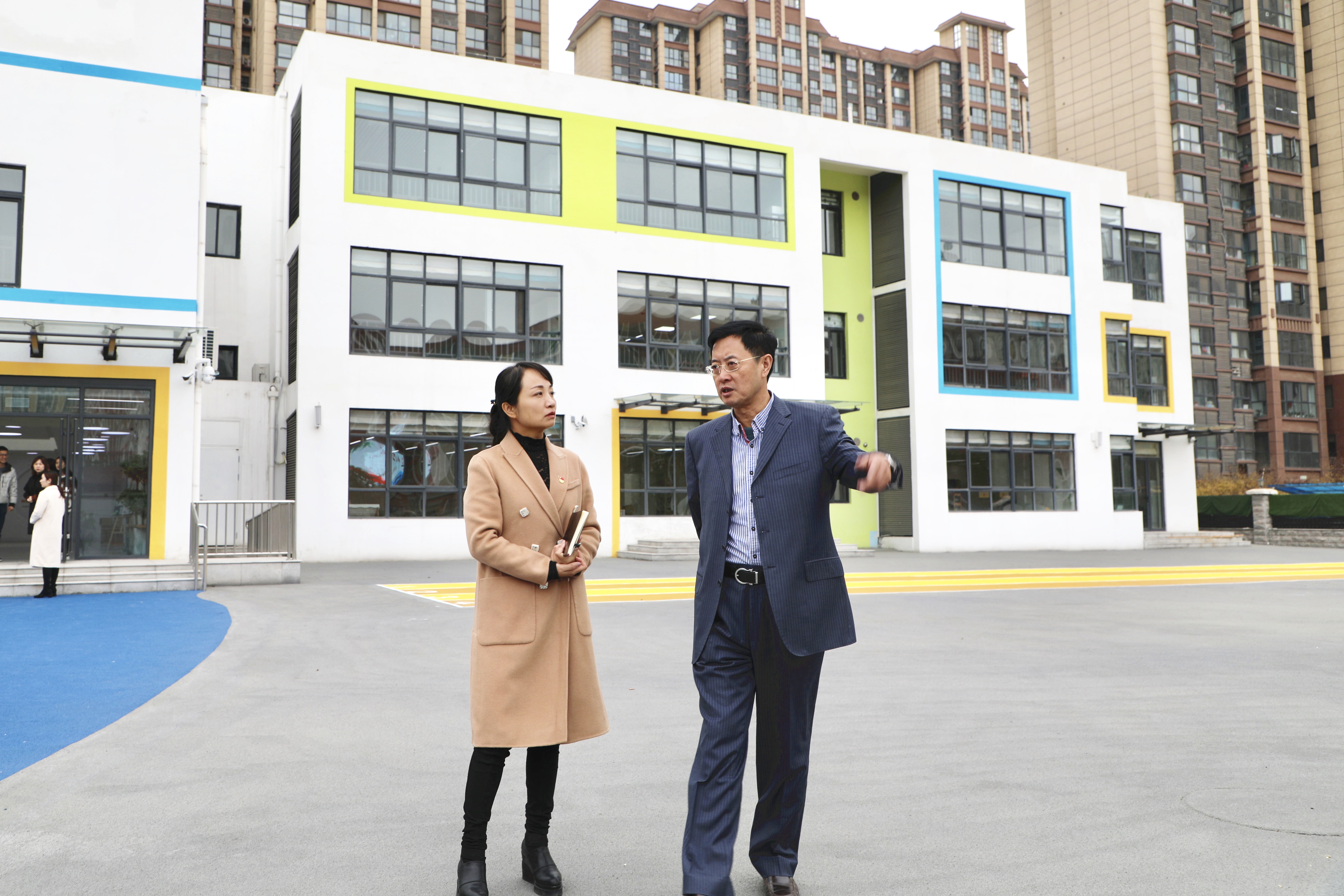 为了调研新建幼儿园筹备进程,检验新成立党支部建设情况,2019年11月26日,郑州市郑东新区教育文化体育局党委书记王恒一行,至郑东新区第二实验幼儿园实地调研。第二实验幼儿园筹备组组长、党支部书记李玲玲带领行政后勤人员陪同参观。
